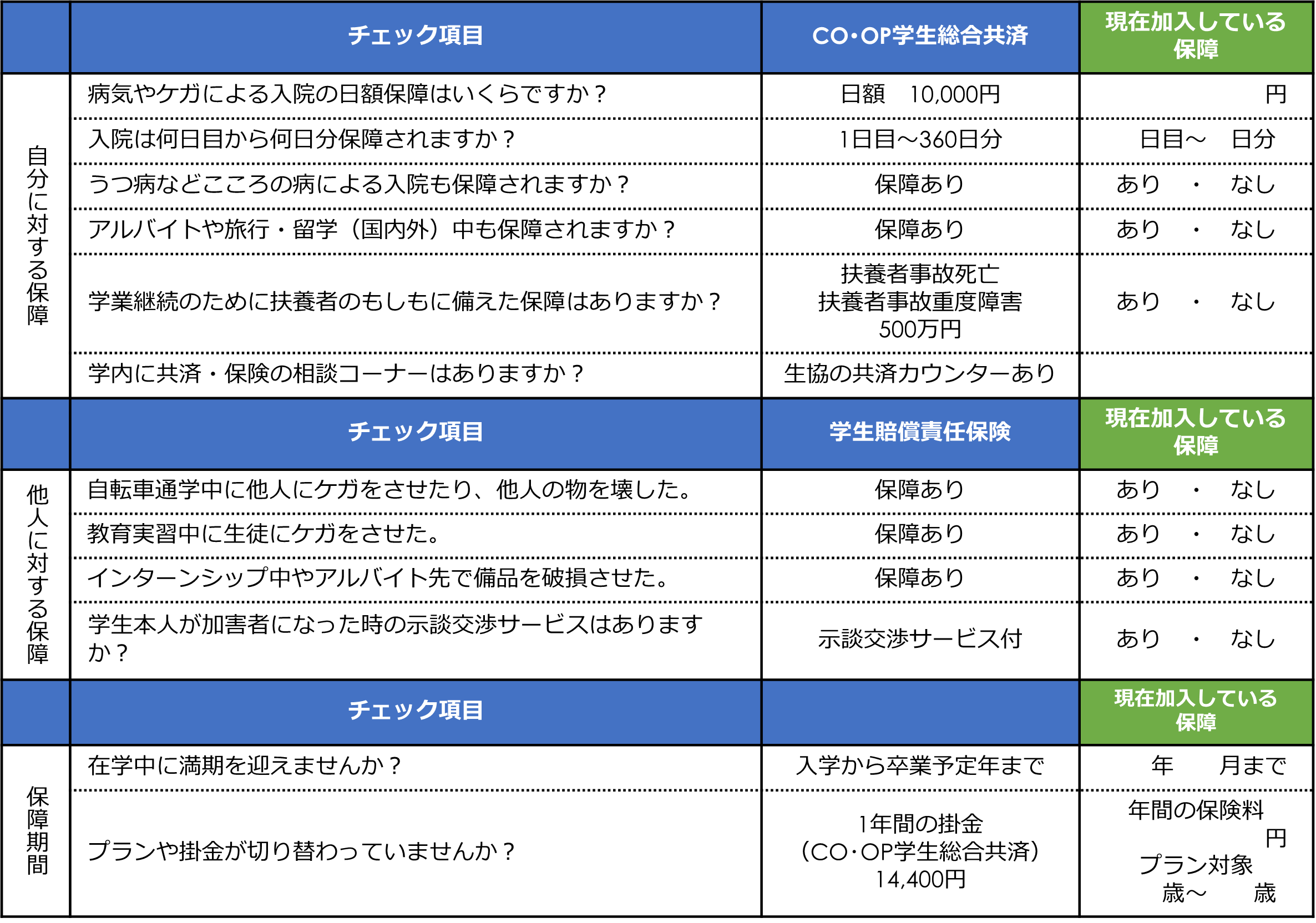 - 生協にだけ加入することは可能ですが、「大学生」には大学生のための保障制度が必要です。すでに加入の保険・共済があっても、あわせてCO・OP学生総合共済への加入をご検討ください。