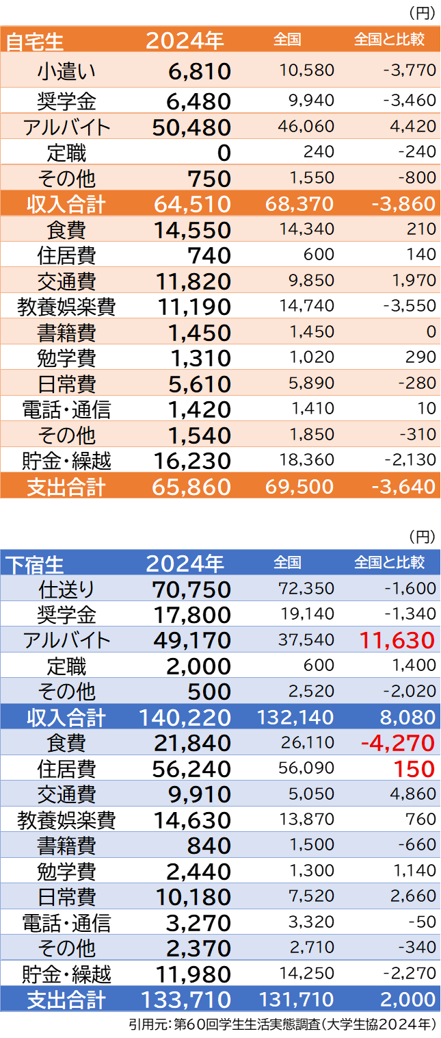 - 2024年大学生活実態調査より(愛知県立大学・愛知県立芸術大学 回答者数 自宅生194人/一人暮らし74人)