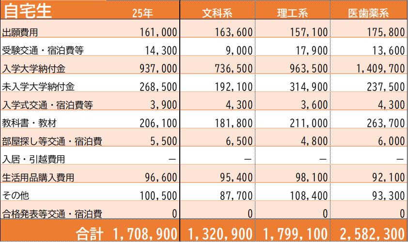 <支出>単位:円 自宅生 一人暮らし 食費 15,530 25,310 住居費 0 58,060 交通費 9,930 5,920 教育娯楽費 11,900 13,750 書籍費 910 2,340 勉学費 1,620 1,440 日常費 5,830 9,190 通話通信料 1,640 4,220 その他 2,470 4,060 貯金・繰り越し 17,450 7,130 支出合計 67,290 131,410