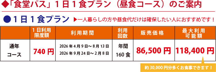 ※食堂パス対象日でも大学学事、授業状況の関係で閉店することがございます。その場合は1年の最後に差額をチャージにて返金いたします。