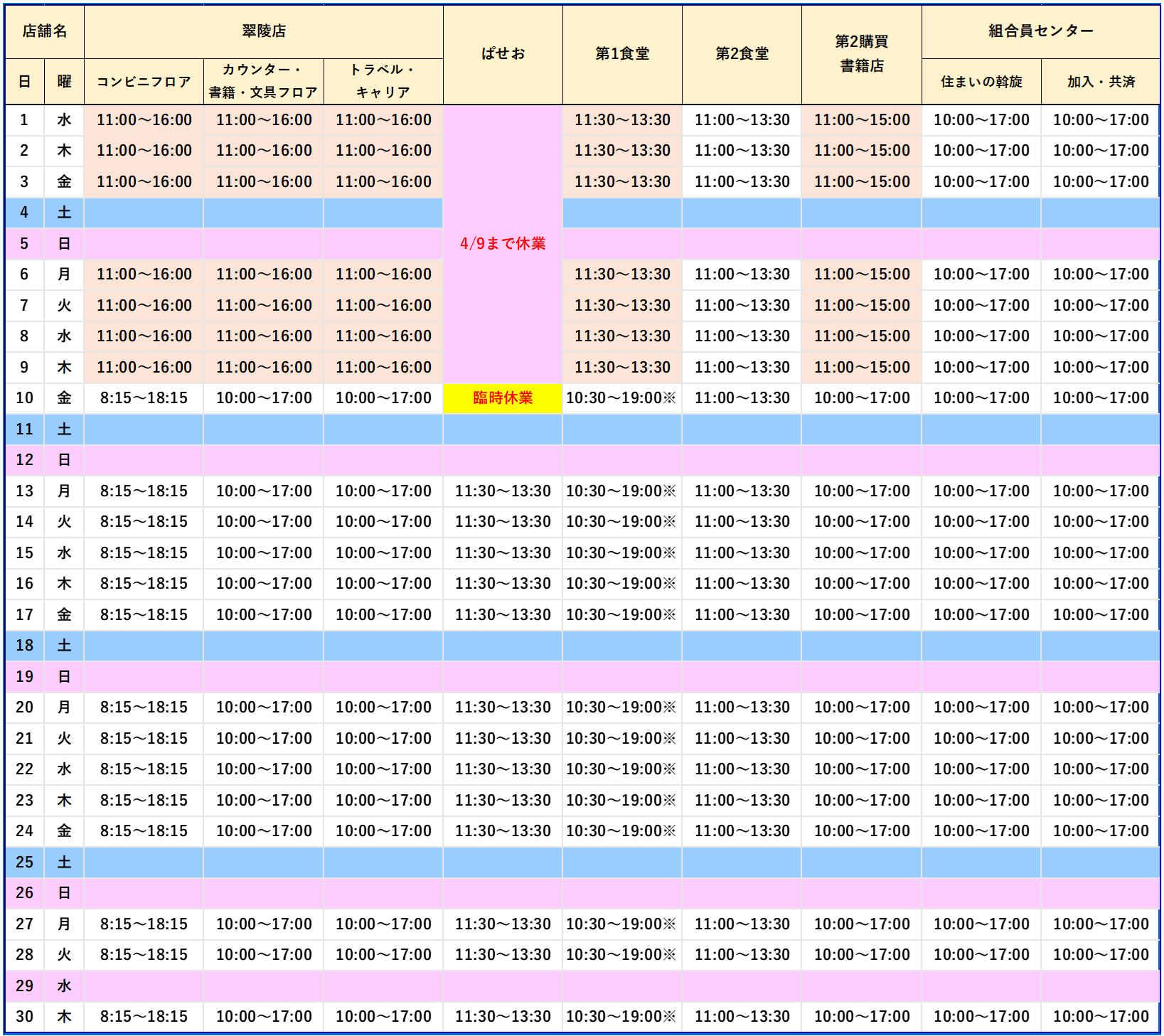 ※第1食堂(4月10日から) 昼食:10時30分~14時(おかず・麺コーナーは11時~14時)、夕食:16時30分~19時(麵コーナーは17時~18時45分)