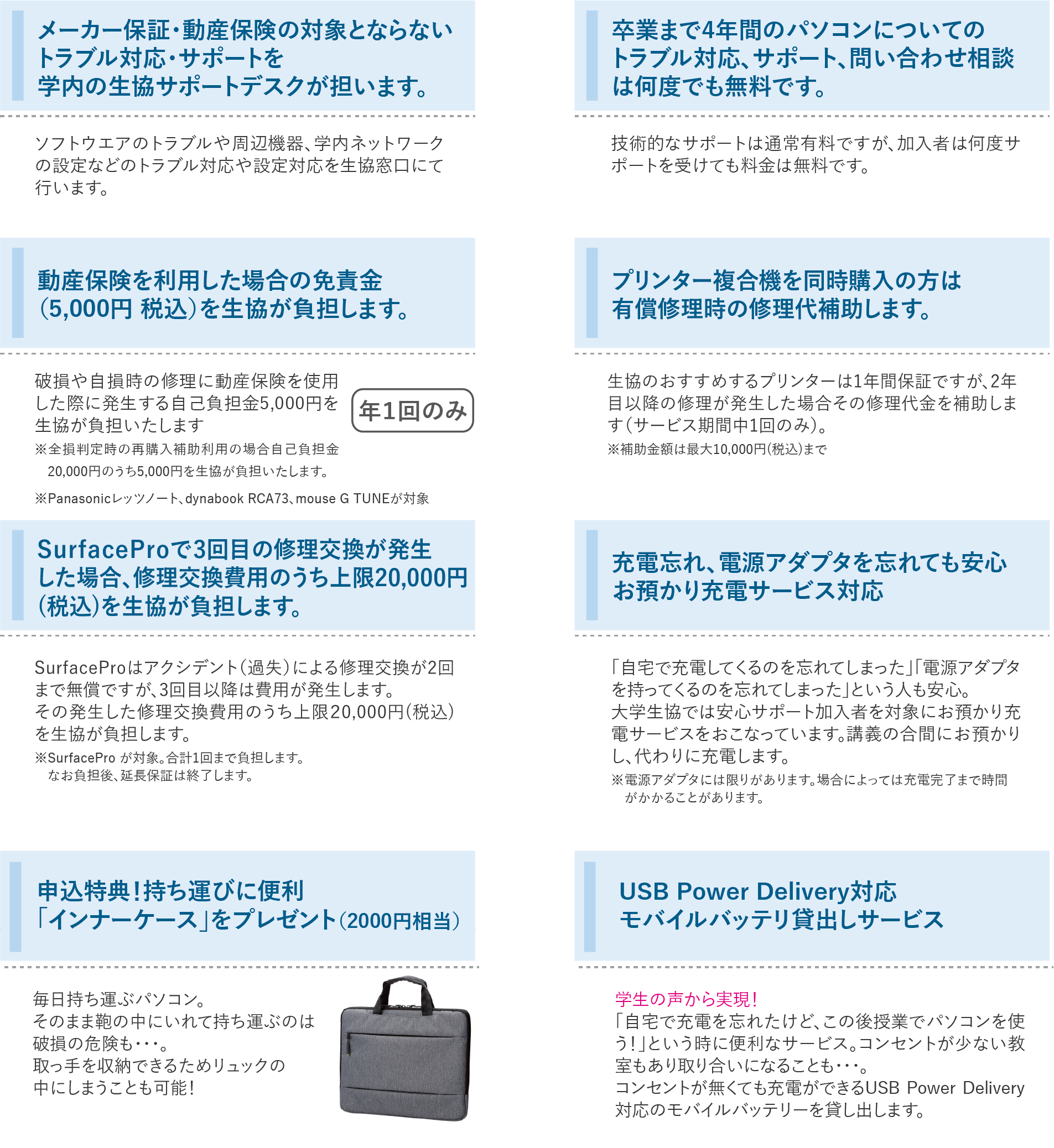 4年間安心サポートパックに加入していたので、修理に出す前のバックアップや修理した後の復元するところまで丁寧に対応してくださり、助かりました。些細なことでも、対応してくださるので、安心してパソコンを使用することができます。今、三重大学ではパソコン必携なので、気軽に何回でも困ったことを相談できる4年間安心サポートパックはとても頼もしいです。また、申込特典の「インナーケース」はパソコンだけではなく、コードも入れることができるので、毎日助かっています。