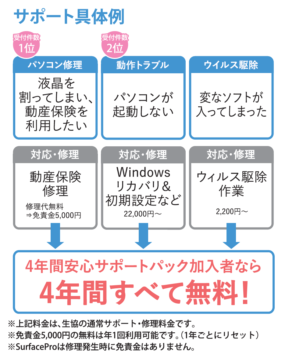 ●4年間安心サポートパックは生協オリジナルパソコンの ご注文時にのみ一緒にお申込みいただけます。なお、サービスの適応範囲はご購入いただくパソコンのみとなります。