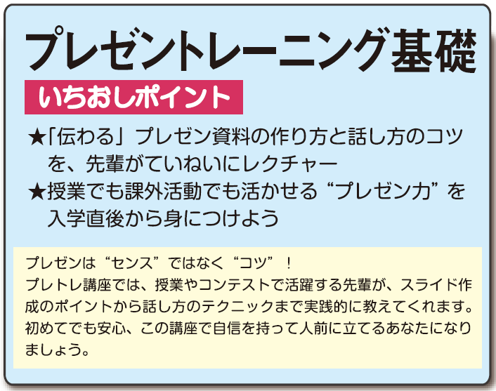 プレゼンで相手に理解してもらうためには、スライドをどのようなレイアウトにすれば良いのか、実験レポートで自分の考察を裏付けるためにはどんなグラフが必要なのかなど、資料には工夫する点がたくさんあります。機能を活用することで自分の表現したいものを形にできるようになります。講座では機能を学ぶだけでなく、グループワークを通じて伝えたいことを伝えられる資料の作成方法身に着けることができます。