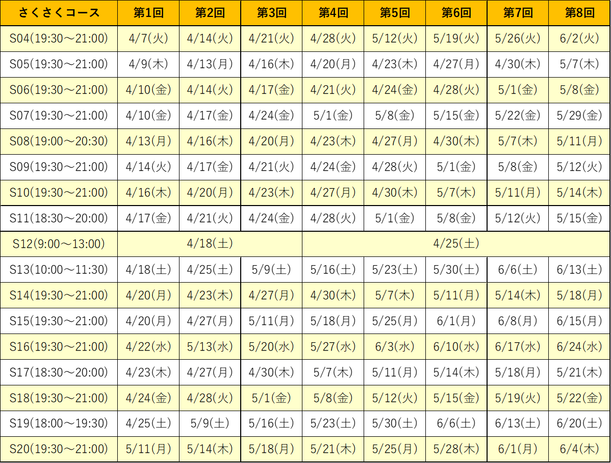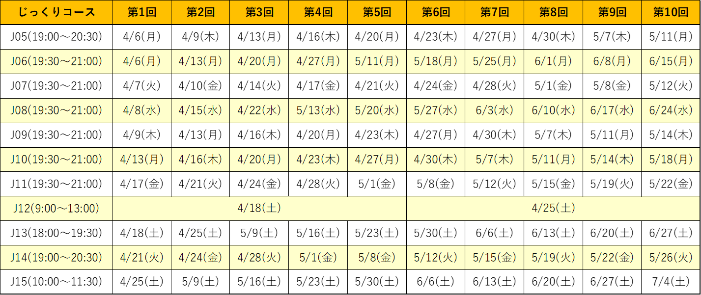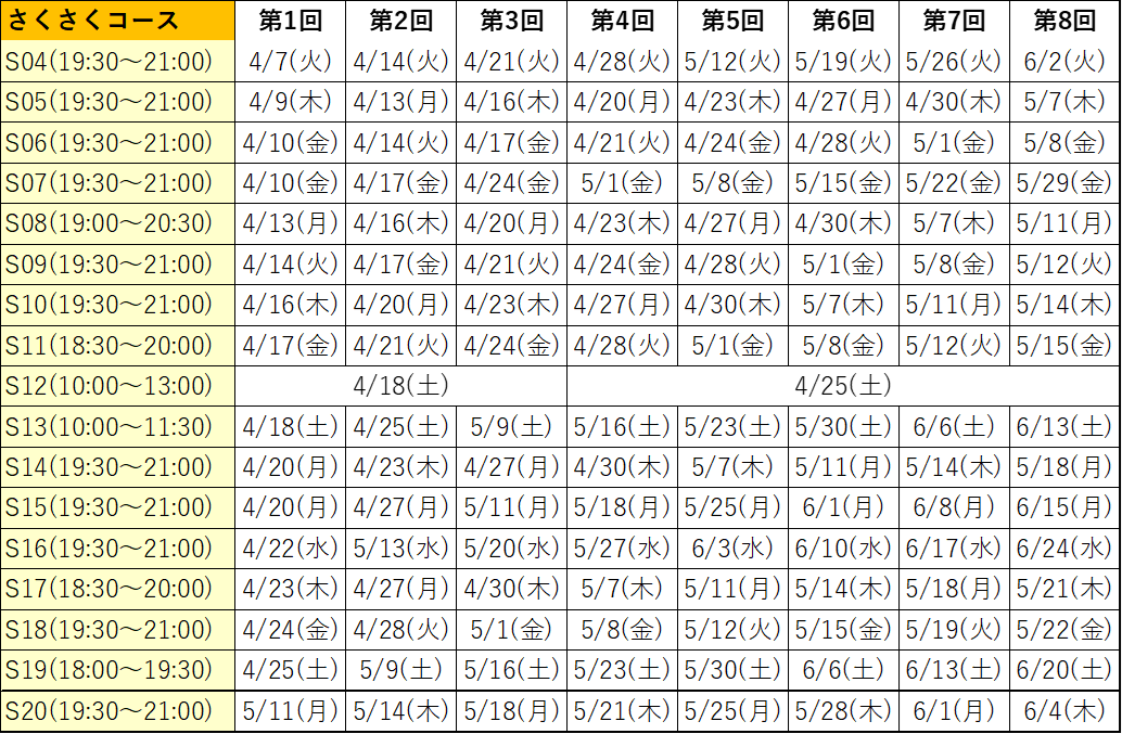 こちらの日程表をご確認ください。お申し込み時に、日程を確認します。