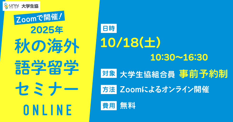 現在受付中の留学相談会です。留学をご検討の方、「今すぐではなくても上級生になってから…」など、どなたでも大歓迎です!下記時間でご都合が合わない方は、生協CamPla店サービスカウンターでもご相談は承っておりますのでお気軽にご相談ください。