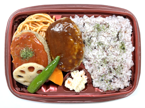 2つ味のハンバーグがあって見た目からとっても美味しそうなのが伝わる+2種類のハンバーグが食べられる!というワクワク感がとってもありました!野菜やお米と合わせることで最後までおいしく、とっても満足度が高かったです!すごく元気がでるお弁当だと思いました!
