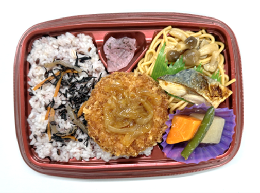 ふわっと柔らかいメンチカツでホッとするお弁当です。野菜や焼き鯖も入っていて、肉・魚・野菜と様々なおかずを楽しめる黄金比のメンバーです。しっかり炒めた玉ねぎが添えられてるのも推しポイントです!