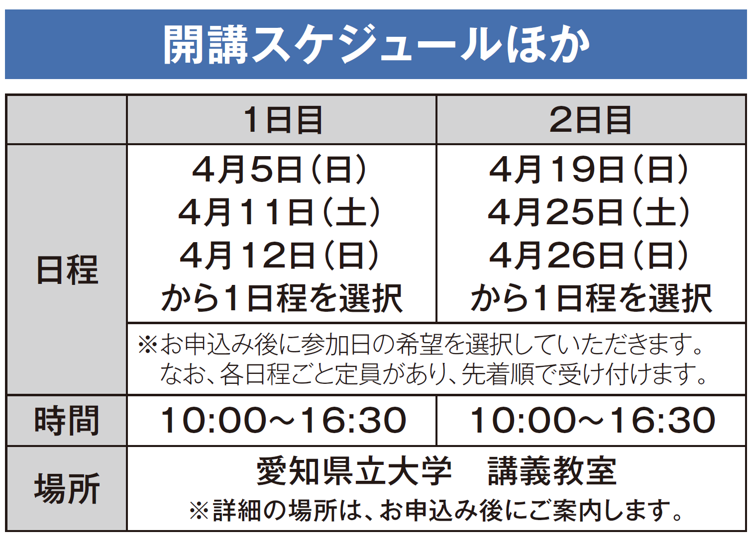 - 講座は2日間のプログラムです。1日目・2日目それぞれ上記の3つの日程からお選びください。