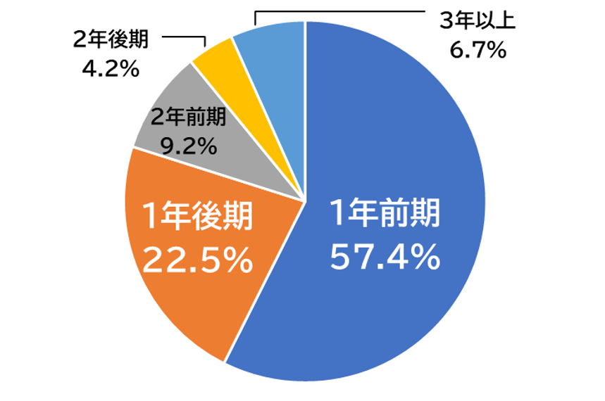 グラフからも80%の方が1年生のうちに運転免許を取得することをおすすめしています。これは上級生になるほど忙しくなり、免許取得のために費やせる時間の確保が難しくなるためです。特に3~4年生は就職活動、教育実習、実験、卒業論文準備、大学院入試などスケジュール調整が難しくなります。