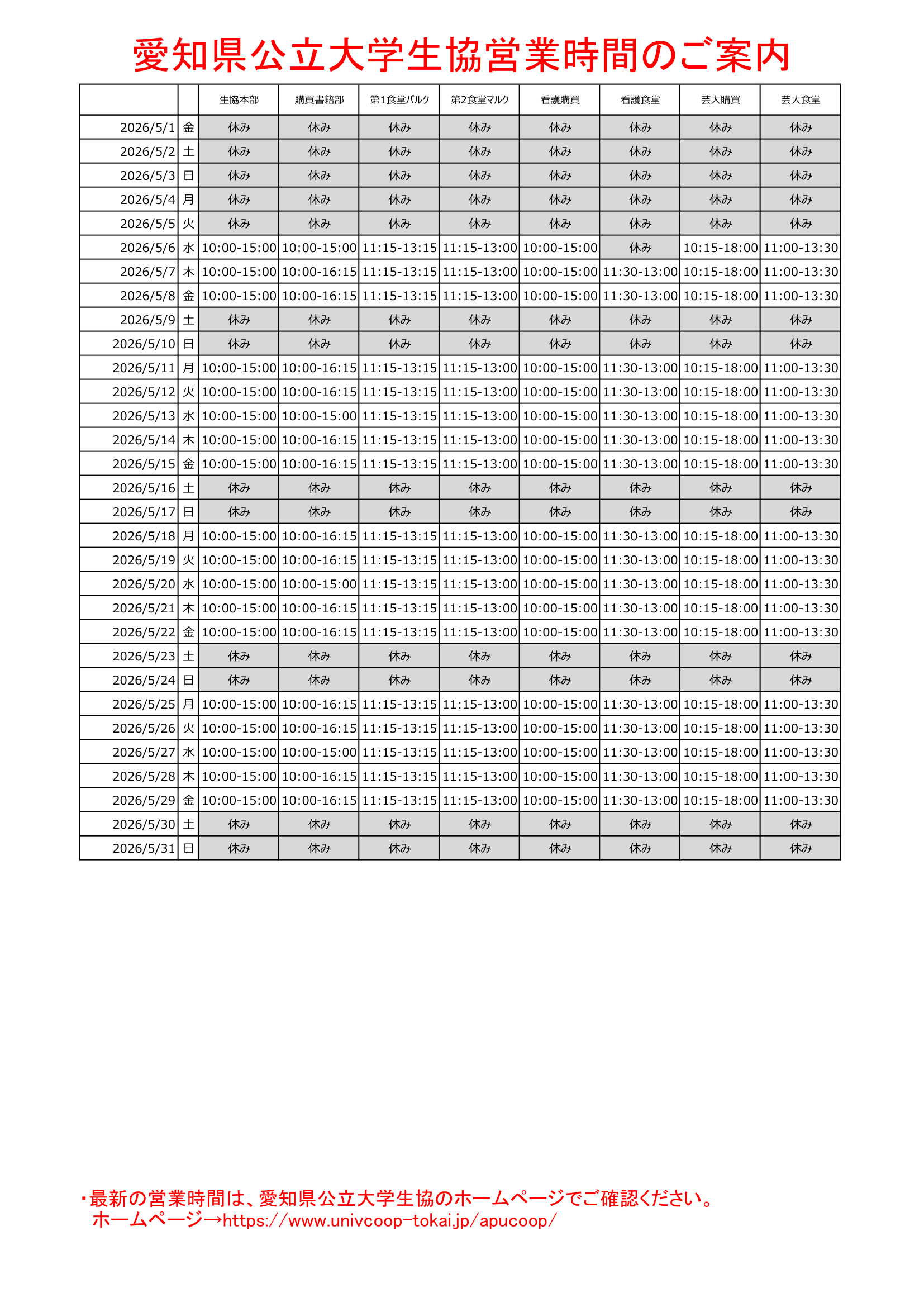 春休みのため、購買は短縮営業、食堂は閉店します。県大長久手キャンパス