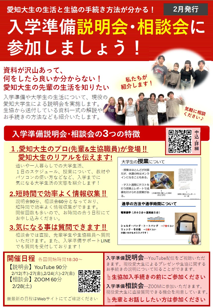 愛知大学生協では、毎年、新入生と保護者の方を対象に「入学準備説明会」を行っています。