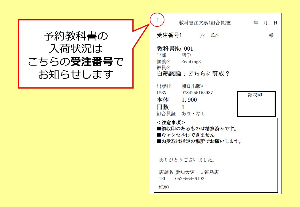 受け取りの際に「教科書注文票(組合員控え)」が必要となります。