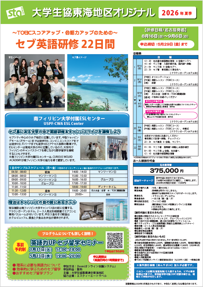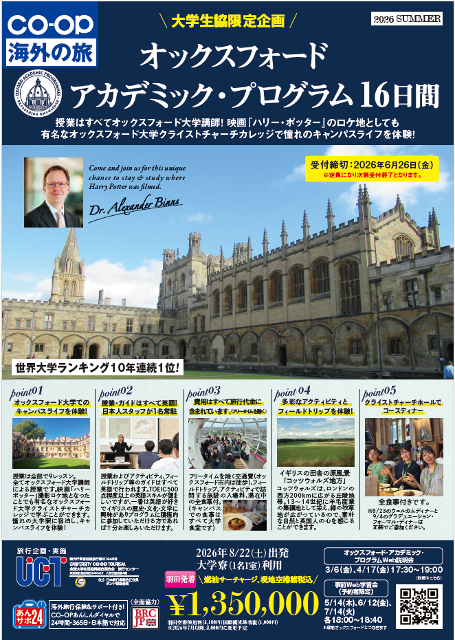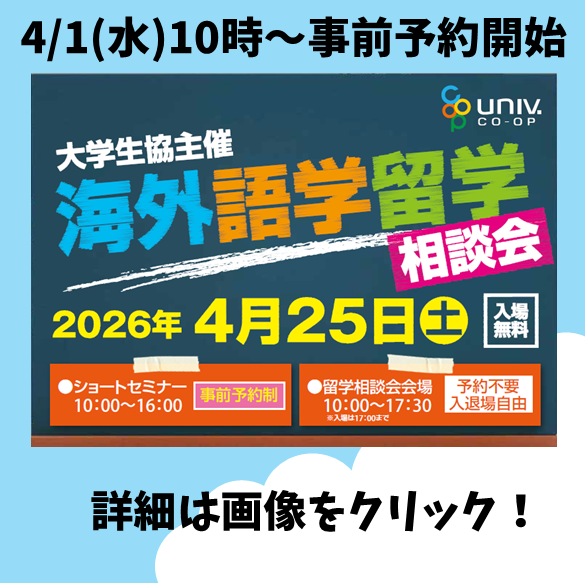 | 5月12日(火) | 大学生協短期語学留学「アクティブ」 | 英語/短期(夏休み、春休み出発) |