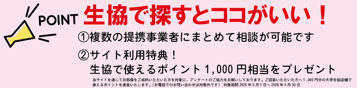 水回りのトラブルや鍵のトラブルなど、一人暮らしをするうえで発生しうるトラブルに対し、相談や対応窓口の紹介、出勤サポートを提供しています。学生生活110番の詳細はこちらから。