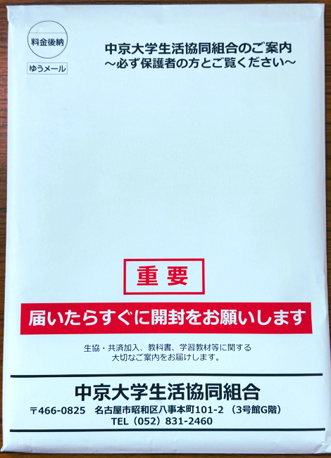 ←入学準備資料は水色の封筒でお送りします。入学が決まられた方で、まだお手元に無い方は資料請求をお願いします。中京大学生協は、大学内で、教科書・教材の販売と、食堂の営業や飲食品の販売など食事のご提供、文具・日用品などの販売をしています。