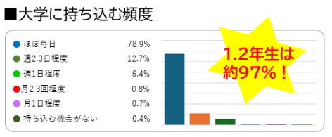 中京大の先輩学生のアンケートでは、大学に持ち込む頻度及び授業における活用頻度は「ほぼ毎日」と「週2.3日程度」を合わせるとほぼ90%以上。1.2年生だけに限定すると約97%の方が「ほぼ毎日」と回答しています。