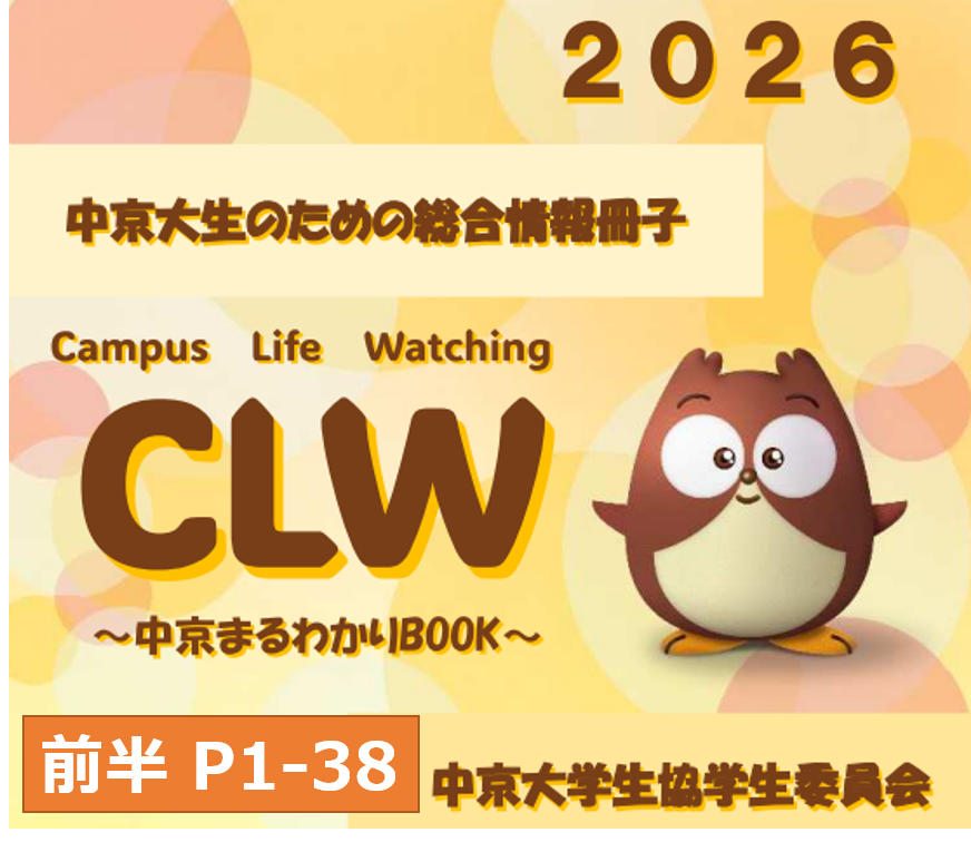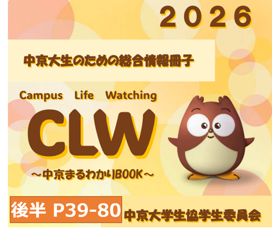 CLW(Campus Life Watching)生協学生委員会に所属する、中京大生の先輩が「新入生の皆さんの不安を少しでも減らし、大学生活を楽しく始められるように」という思いで作られた冊子です。