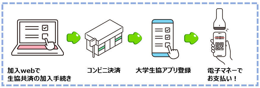 生協・共済加入手続き → コンビニ決済 → 大学生協アプリ登録 → パソコン・教材等をECサイトで申込と手続きを進めてください。