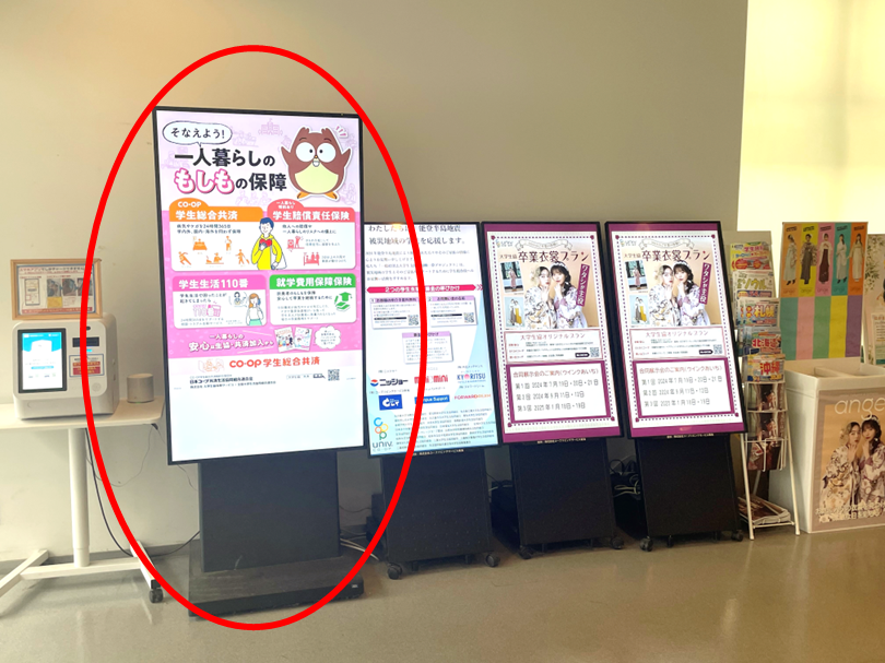 Booksフロンテ横の食堂です。会計後の正面柱に設置されており、食堂を利用する多くの学生の目に留まります!