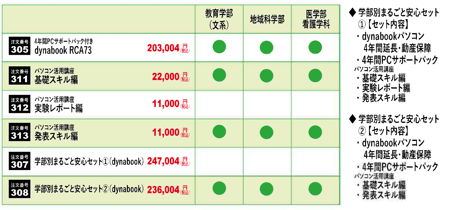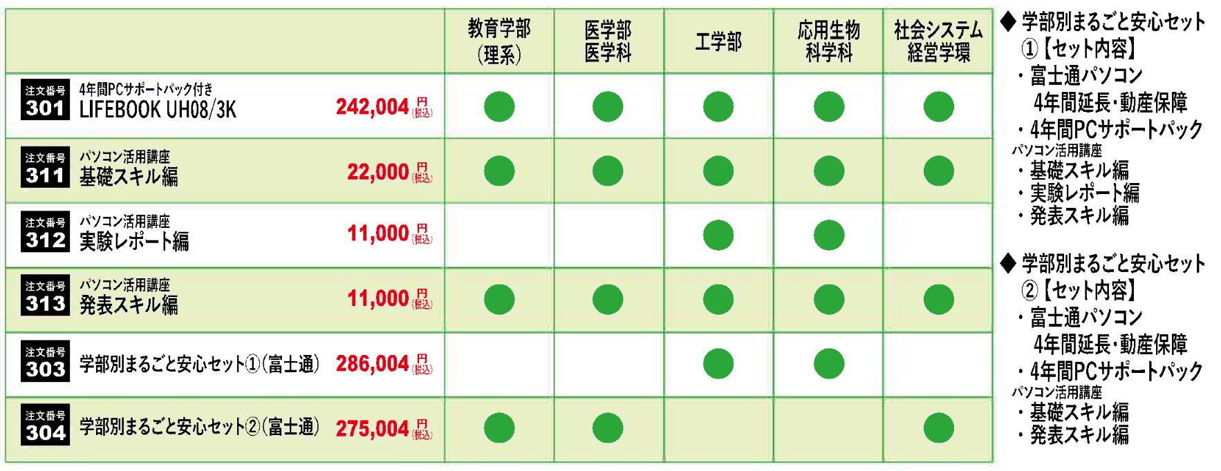 【おすすめセット内容及び推奨学部】