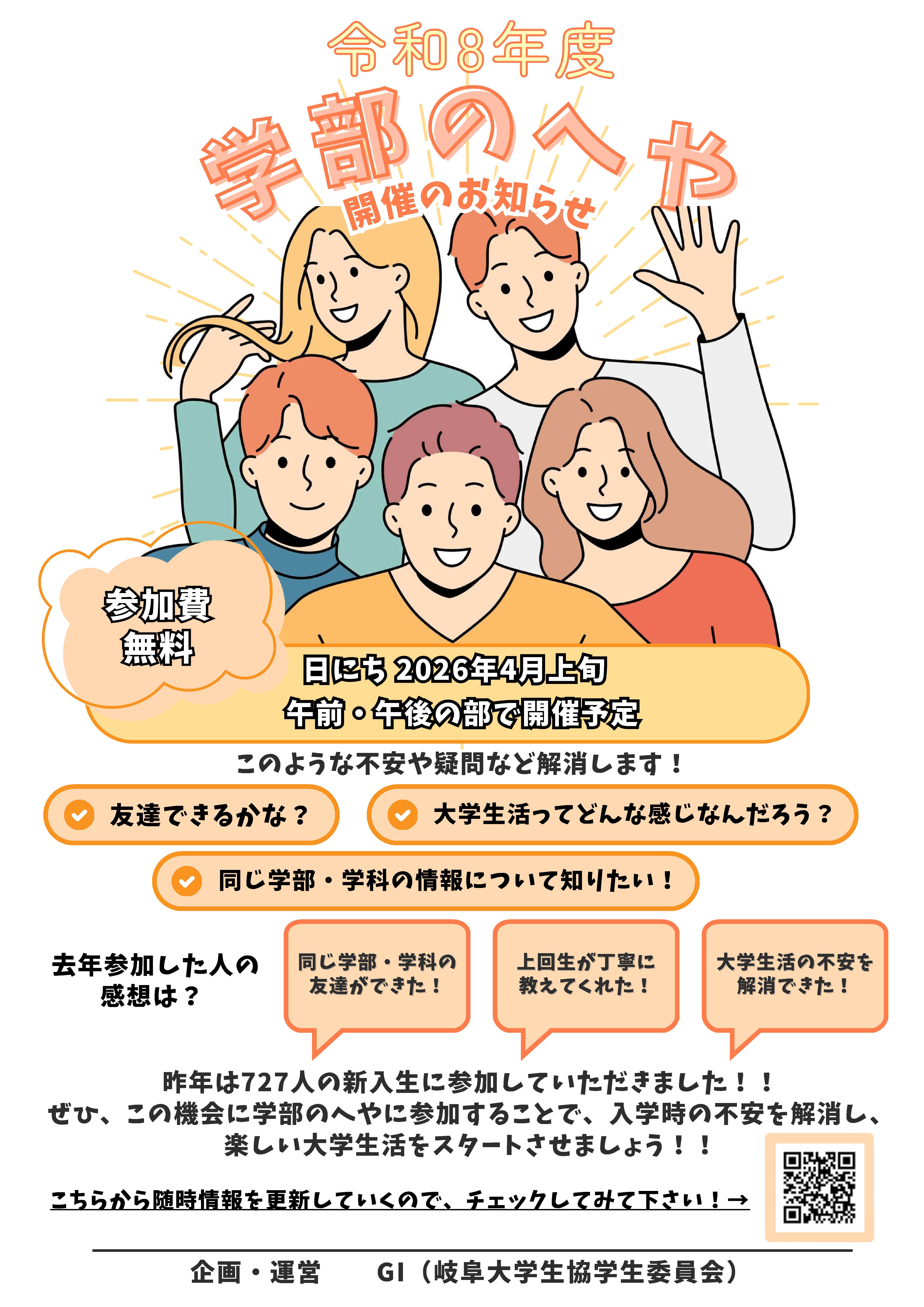 新入生が自分の学部・学科の先輩から学部・学科特有の情報を教えてもらったり、新入生同士で交流したりすることによって入学時の不安を解消し、安心して大学生活をはじめてもらおうという企画です
