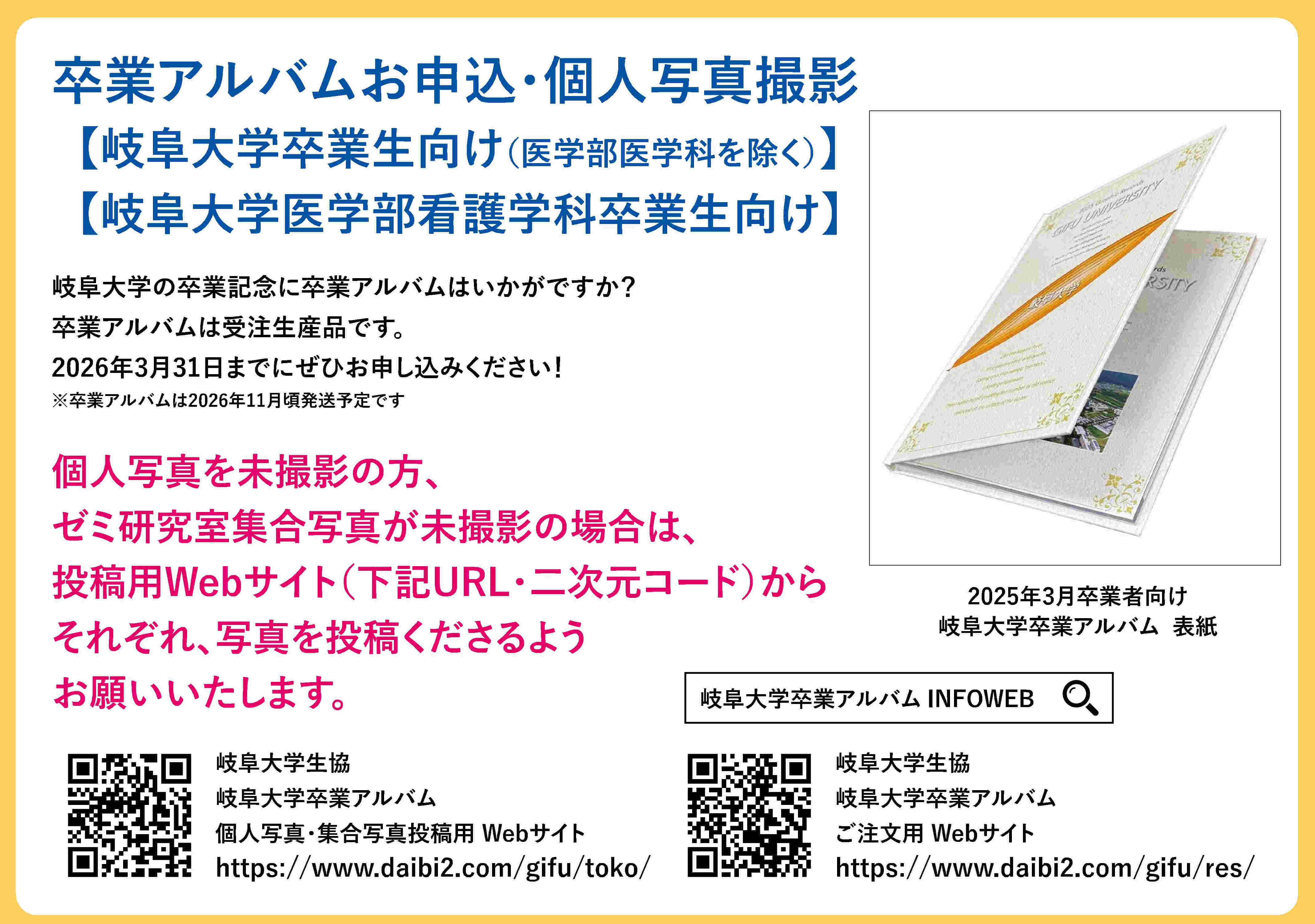 - 岐阜大学卒業アルバム(医学科を除く)・岐阜大学医学部看護学科卒業アルバムをお申し込みいただいている方は、2025年3月発行版をお受け取りになるか、2026年以後発行版をお受け取りになるかを、備考欄にご入力ください。