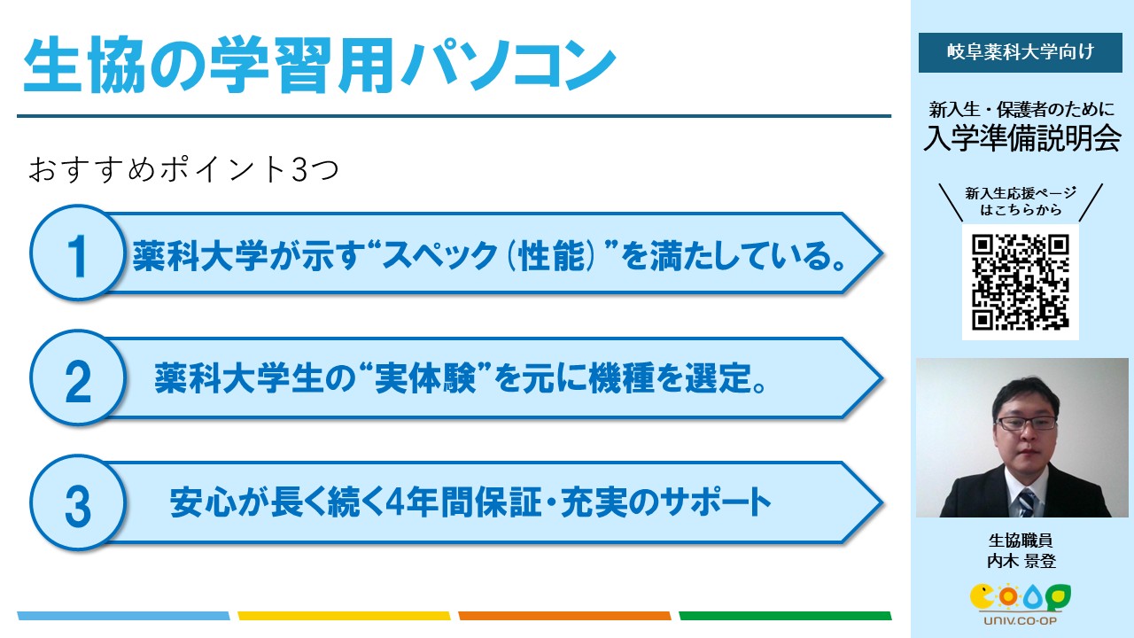 岐阜大学生協職員が、入学準備についてお知らせいたします。岐阜薬科大学の先輩方の「声」を元に新入生の皆様の大学生活に必要なもの、役に立った事をご提案いたします。