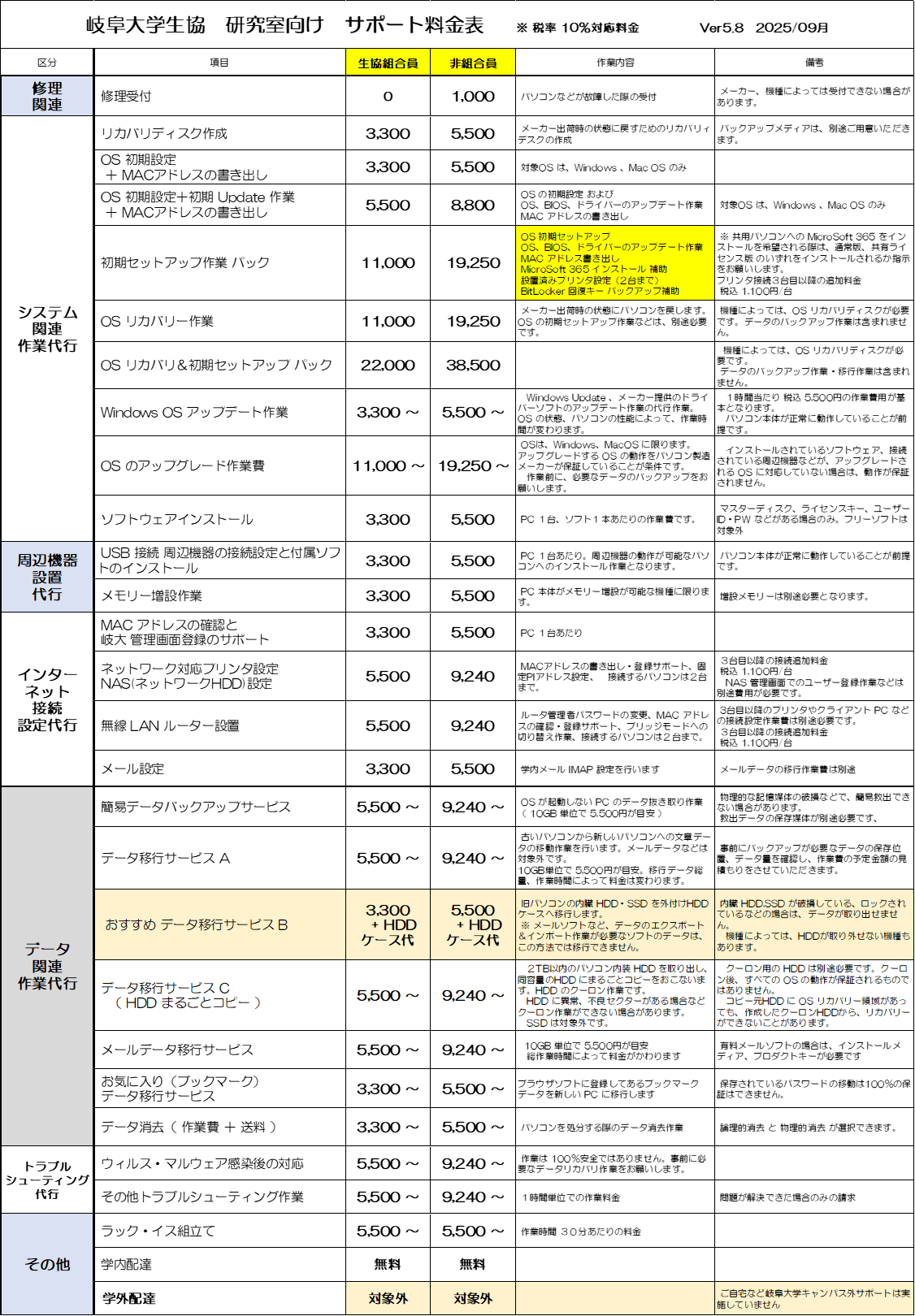 くわしくは別紙「岐阜大学生協 研究室向け サポート料金表」を参照ください。