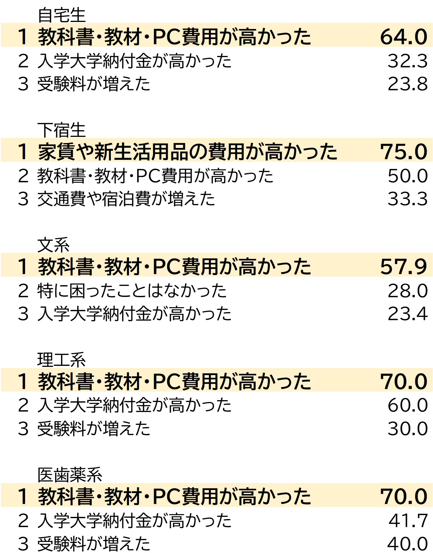 ▶ 受験から入学までで困ったこと ▶心配なこと ▶ 受験前の費用と違って困った費用