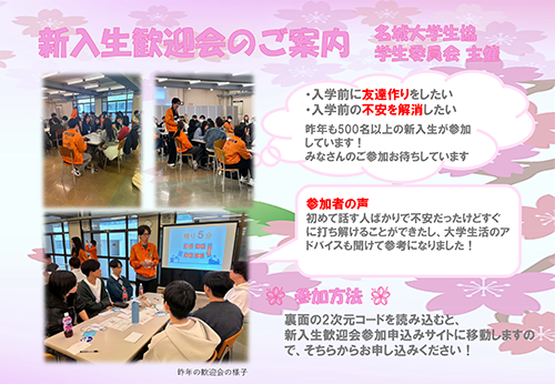 名城大学生協学生委員会では新入生の不安解消のために「新入生歓迎会」という友達作りの場を設けています。