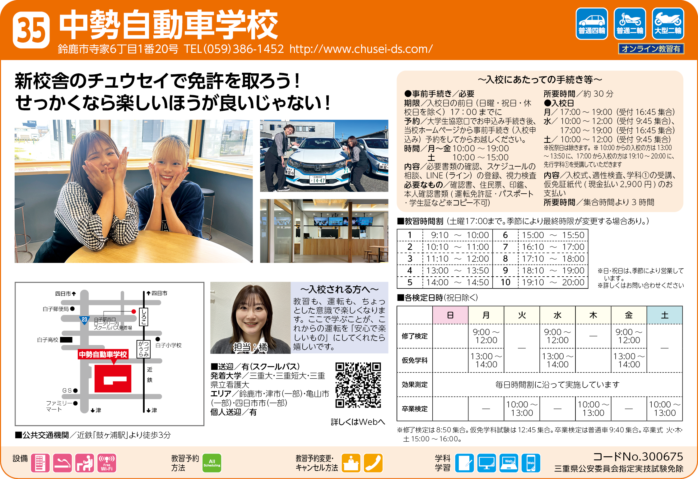 三重短大生協では学生の皆さんに、できる限り1年生のうちに免許を取得することをお勧めしています。