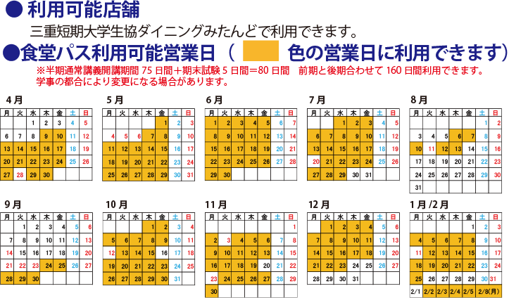 ※食堂パス対象日以外でも大学学事の関係で営業することがございます。その場合はキャンパスペイや現金でご利用いただけます。