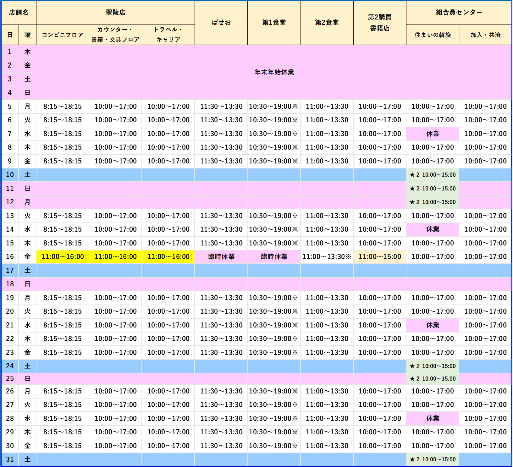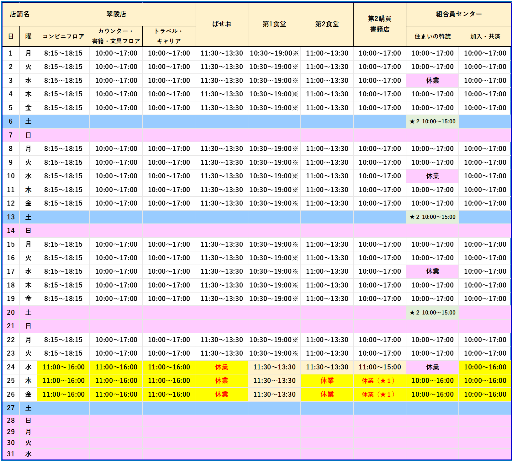 ★1 第2購買書籍店は、12月25日、26日のみ店舗は休業しておりますが、「校費対応・納品業務」のみ行っております。従業員不在の時間が多いためお問い合わせはメールにてお願いいたします(お急ぎの場合は翠陵店へお問い合わせください)。