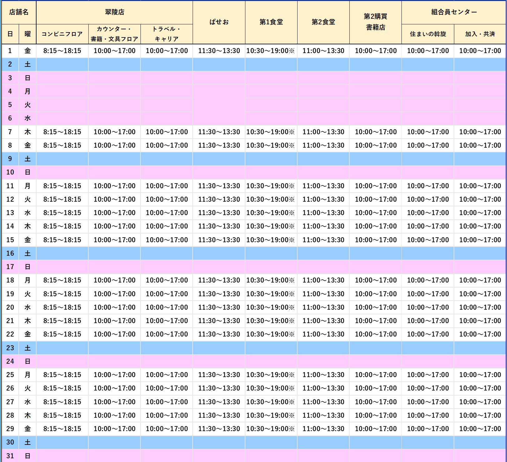 ※第1食堂(4月10日から) 昼食:10時30分~14時(おかず・麺コーナーは11時~14時)、夕食:16時30分~19時(麵コーナーは17時~18時45分)