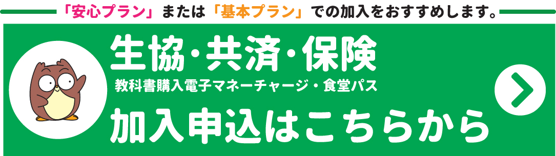 病気やケガ、他人への賠償責任が発生した際、窓口にお見えになったみなさんが、「加入していなくて保障されなかった」という ことも発生しています。「まさか」はいつ起こるか分かりません。「安心プラン」または「基本プラン」でのお手続きをよろしくお願いいたします。