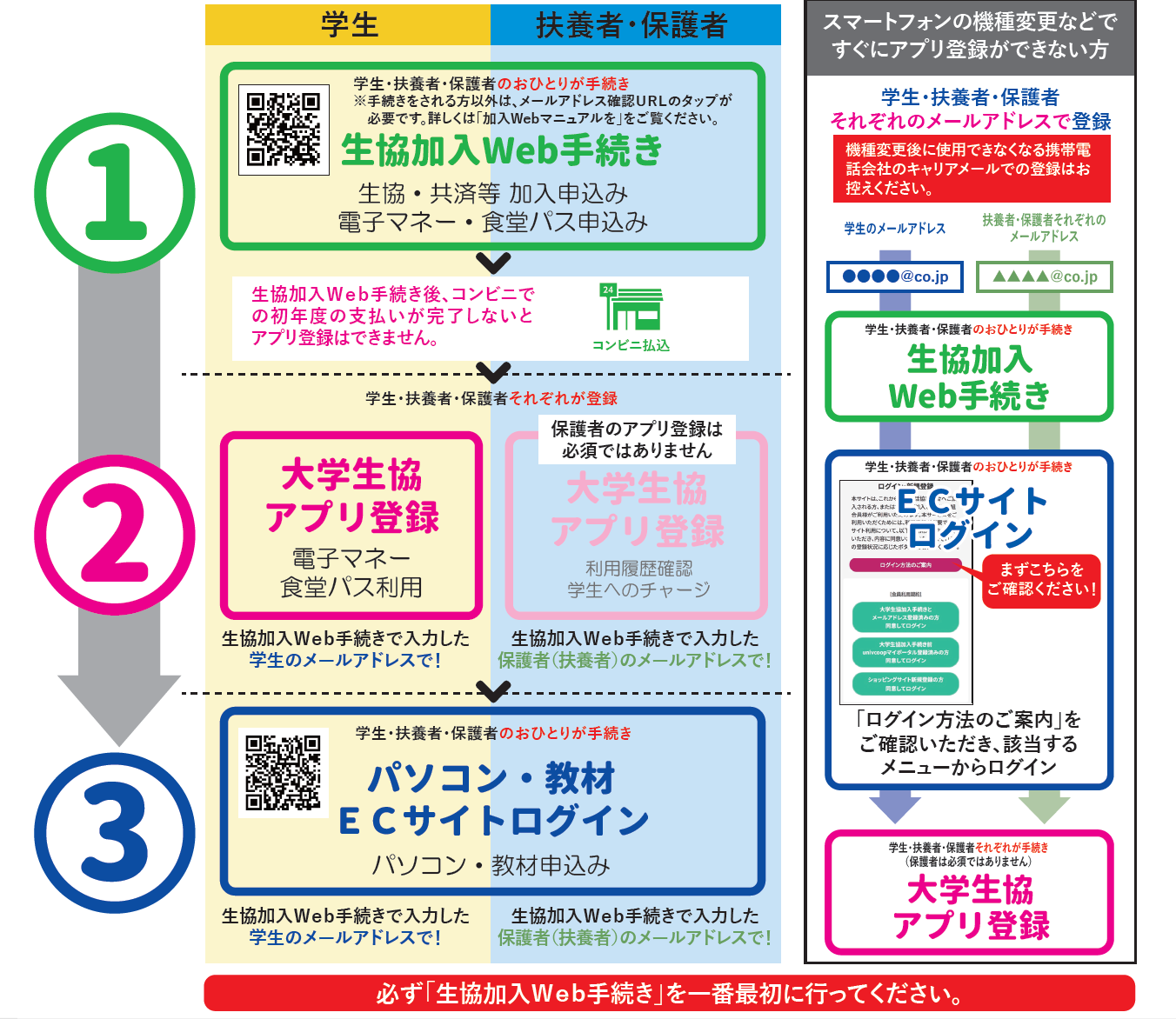 - 教材注文サイトでは、可能な限り生協・共済などの加入申込時に登録した新入生ご本人のメールアドレスでログインしてください