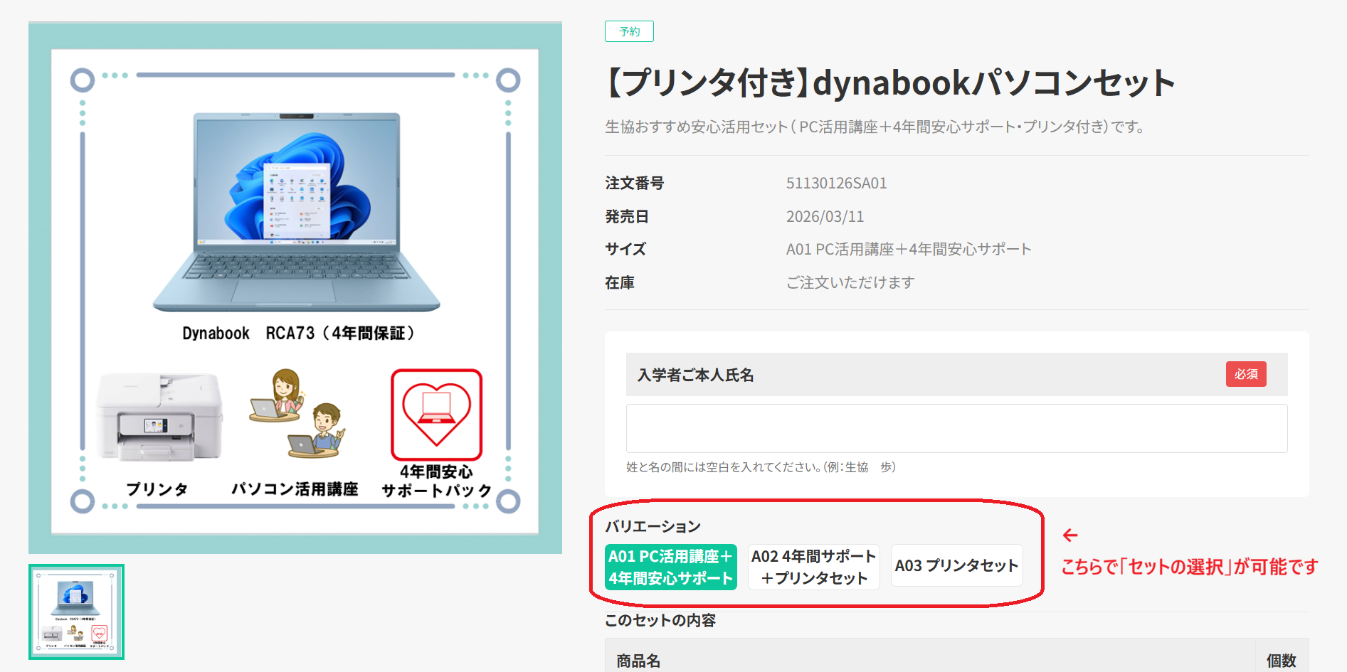②バリエーションで「セットの選択」が可能です。こちらでお選びください