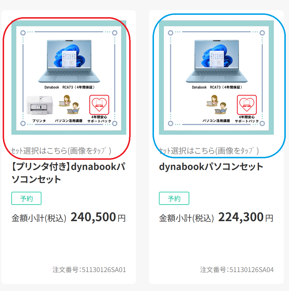 ①「プリンタ付き」か「プリンタなし」かを選択し「画像をタップ(クリック)」してください。