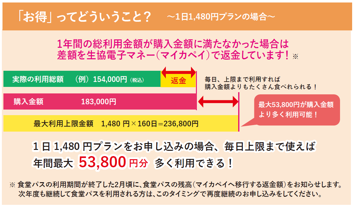 食堂パスは、購入した年度内での使用額が購入金額に満たない場合、差額を生協電子マネー(マイカペイ)に返金させていただくことになっていますので、損をすることがなく、安心です。