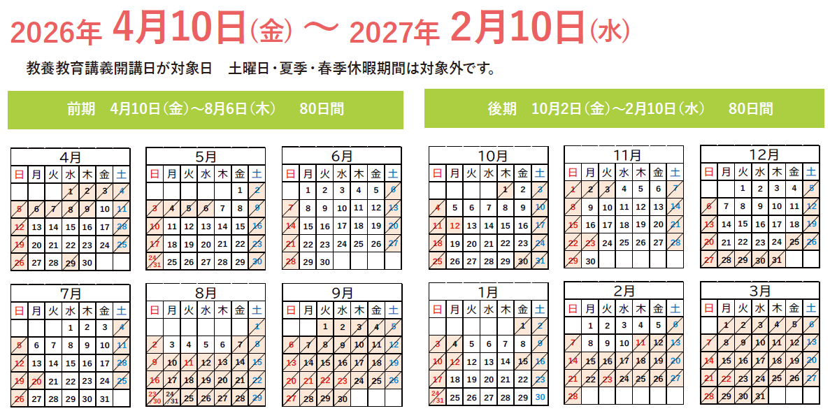 ■土日祝日以外の対象除外日(斜線日)については、大学の行事予定表に基いています。
