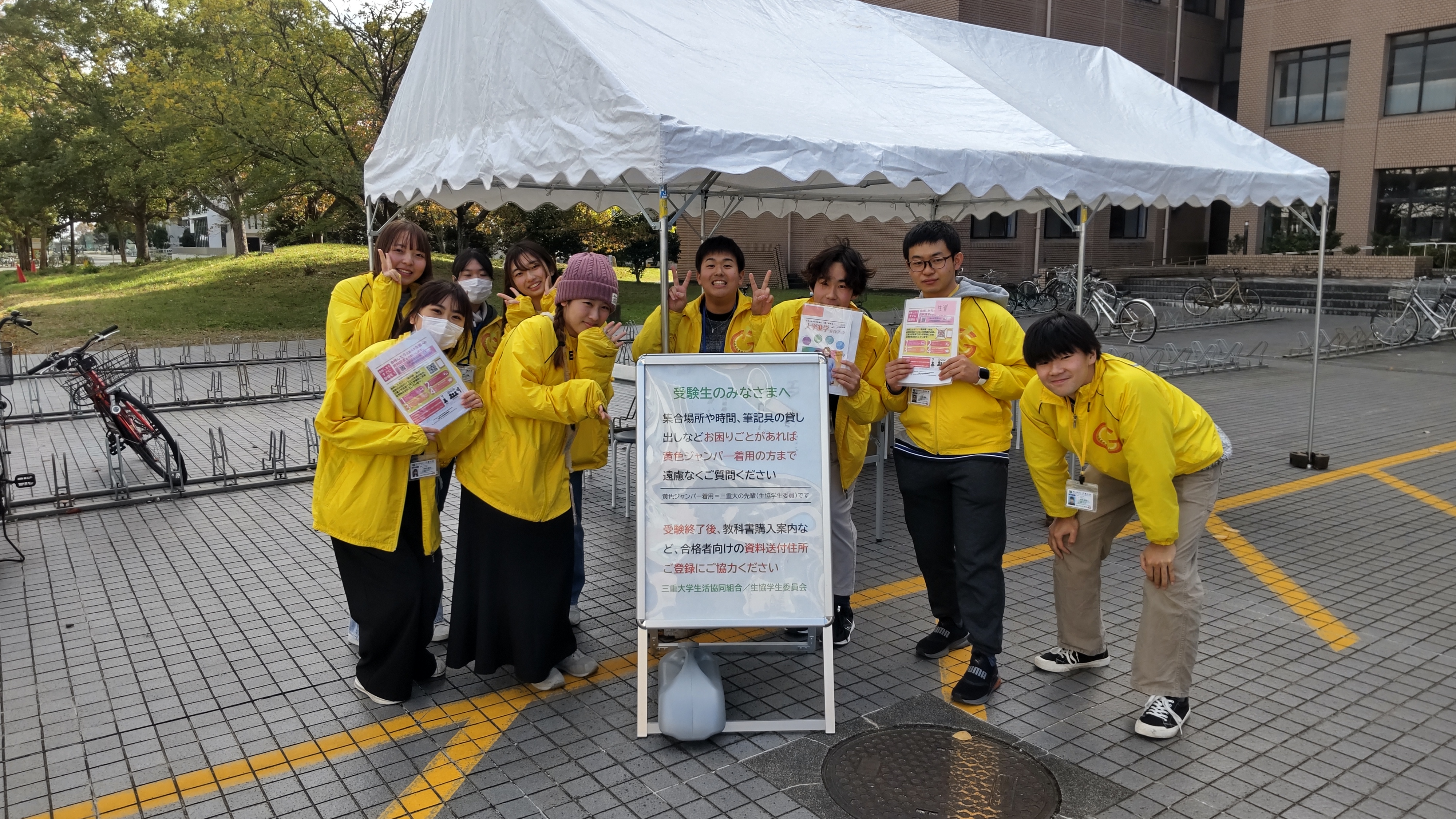 三重大学は敷地が広く入試会場が分かりにくいことも・・・。受験生が安心して試験を受けることができるようにサポートしています。気軽に声かけて下さい!