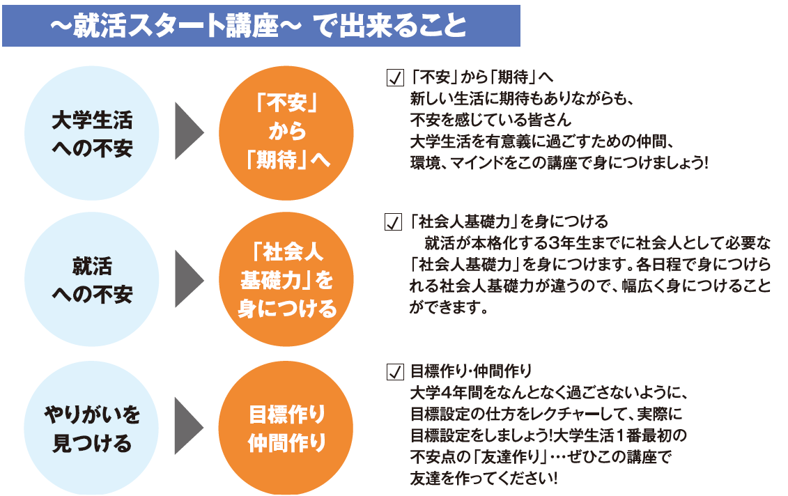 この講座では、すべての就活のスケジュールが前倒しされる中で名市大の学生として、就職活動に臨む前に必要な社会人基礎力を身につけることができます。