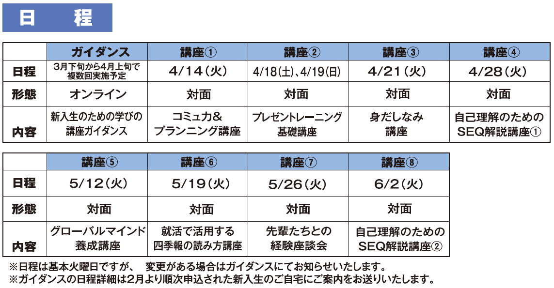 この講座を通して、新入生の皆さんには多種多様な経験の機会を提案します。また人間関係の幅を拡げるだけでなく、新入生が最初に身につけるべきスキルやマインドを併せて学ぶことができます。
