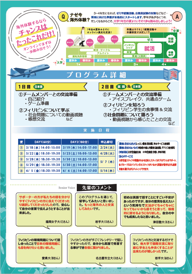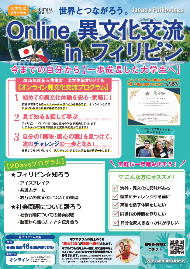 そんな方のための大学生協オリジナルのプログラムで、全国の新入生と一緒にフィリピンの学生との英語での交流を通して、現地について知るのはもちろんのこと、SDG’sや社会問題、将来の夢など様々なトークテーマの中で、自分がどんなことに興味をもち、関心をもつのか、みなさん自身についての理解も深まるはずです。