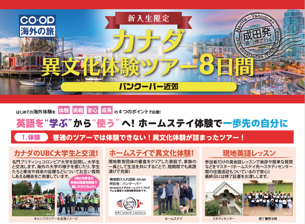 こちらも大学生協オリジナルのプログラムで全国の1年生同士で「はじめての海外」にチャレンジします。