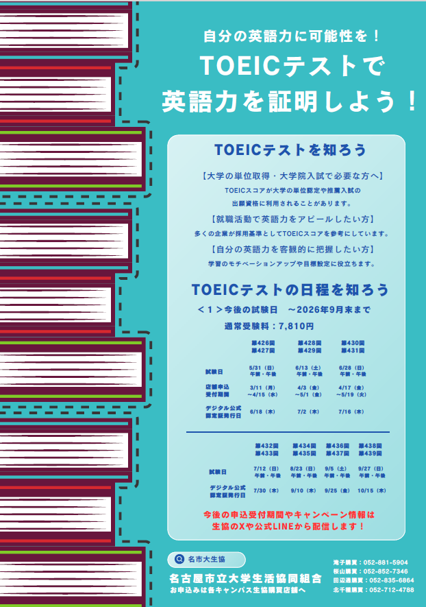 申込は各キャンパス生協購買で受け付けております。店舗の営業時間はこちらをご覧ください。