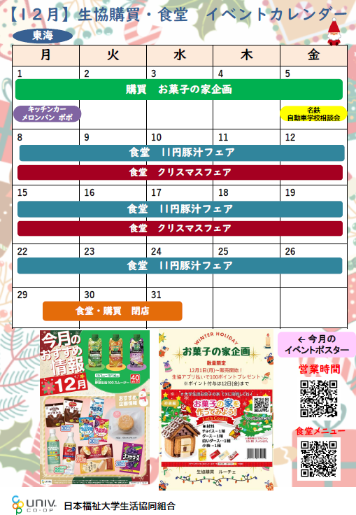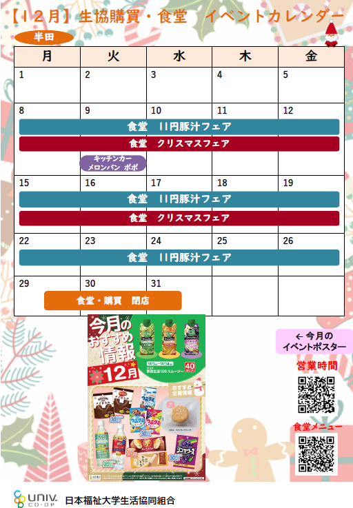 各キャンパスの食堂メニューは、こちらからご覧いただけます。※大学生協アプリ内のブラウザからは閲覧できません。SafariやChromeなどからアクセスしてください。