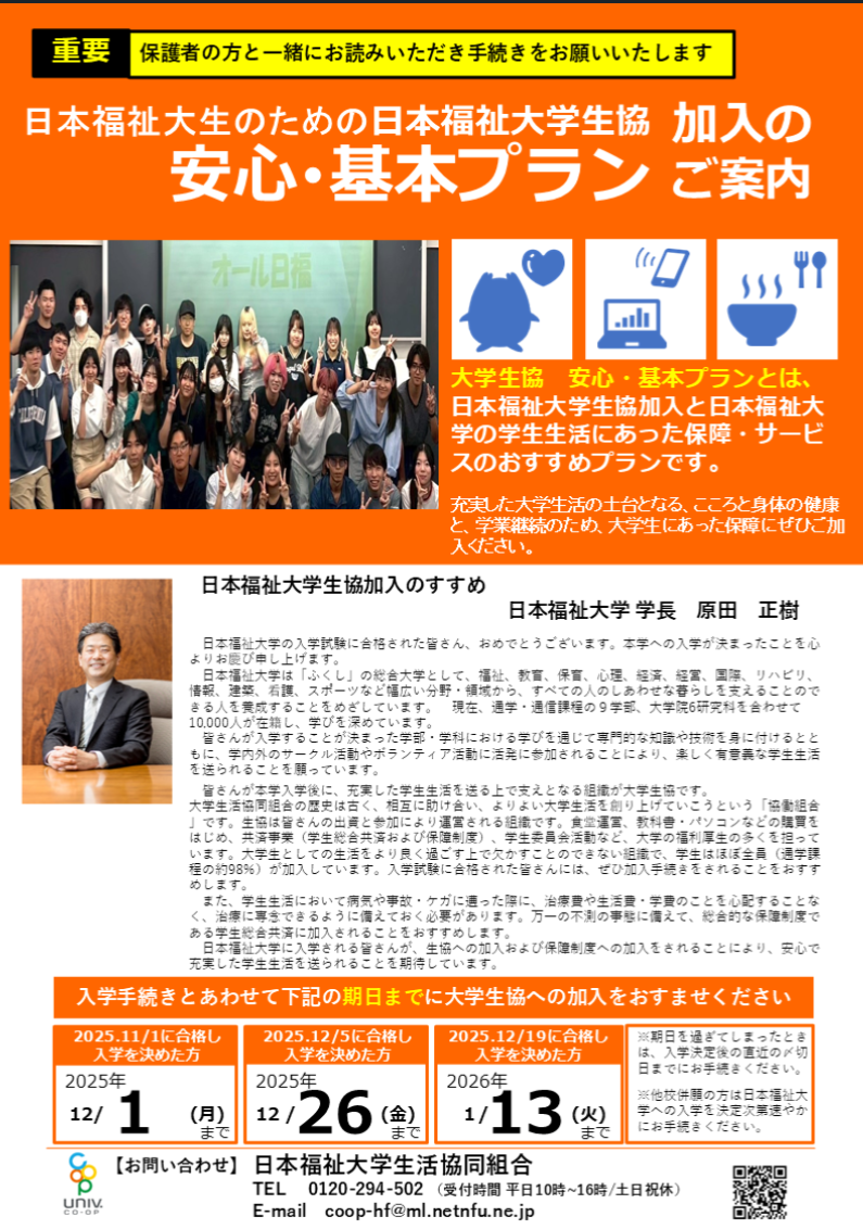 生協加入にあたっては、日本福祉大学での大学生活・学業継続のために、安心プランまたは基本プランでのご加入をおすすめしています。