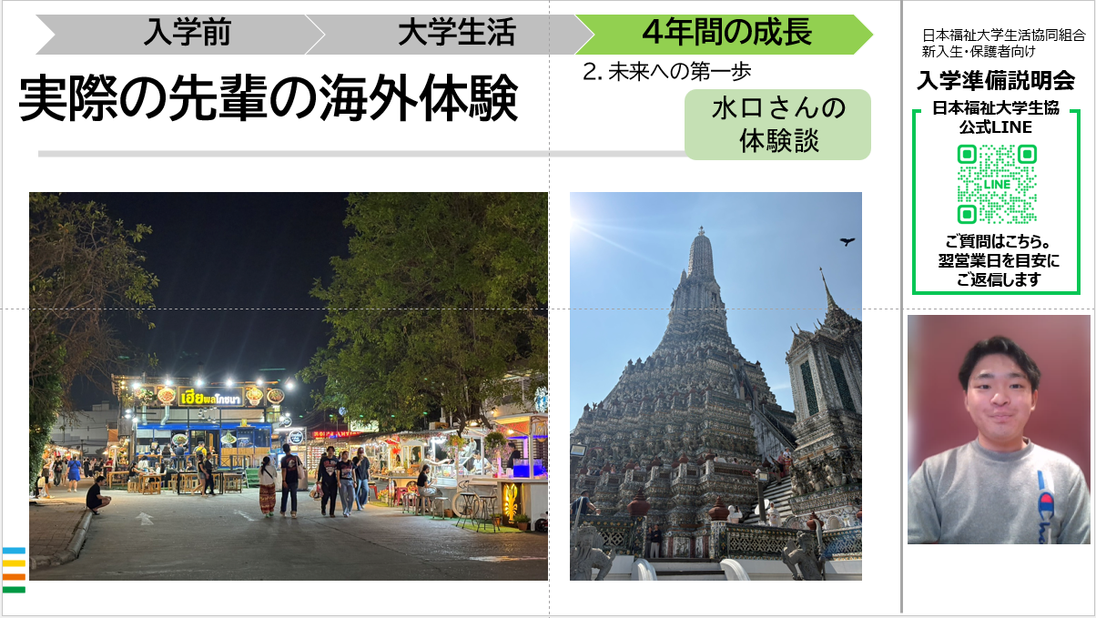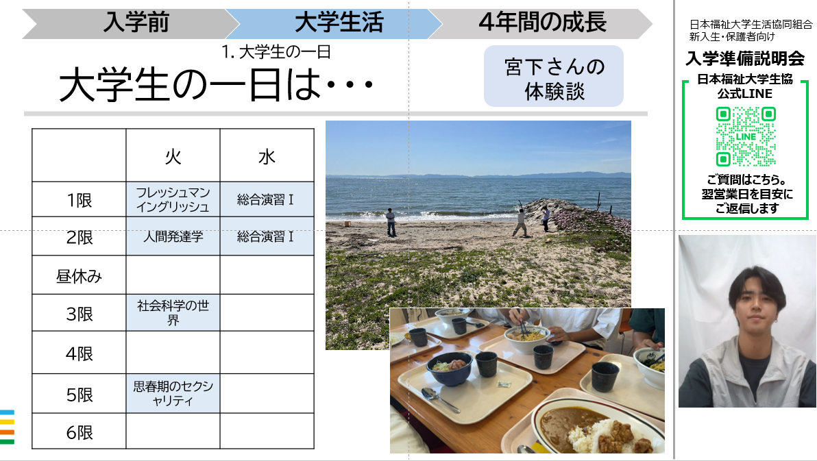 説明会では、日本福祉大生の先輩から、「入学当初のスケジュールの紹介」、「日福大生の一日を例に大学生活の紹介」、「大学生協活用法」、「生協主催の新入生歓迎企画について」などのお話をし、スペシャルコンテンツとして卒業を控えた4年生から新入生の皆さんへのメッセージをお話ししています。